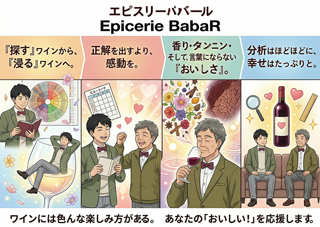 楽しみの提案 2026年4月3日 最終更新日時 : 2026年4月4日 owner香りなどを「探す」ワインから、美味しさに「浸る」ワインへ。正解を求めるより、感動を。香り・タンニン・ミネラルそして、言葉にならない「おいしさ」。分析はほどほどに、でも幸せはたっぷりと。様々な通知が受け取れるTwitterも是非よろしくお願いします! @epiceriebabarFacebookXBlueskyHatenaCopy