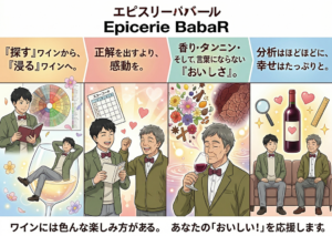 香りなどを「探す」ワインから、美味しさに「浸る」ワインへ。 正解を求めるより、感動を。 香り・タンニン・ミネラルそして、言葉にならない「おいしさ」。 分析はほどほどに、でも幸せはたっぷりと。